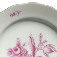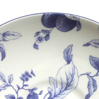 | ボーンチャイナとは骨灰(リン酸カルシウムを多く含む)を25%以上含んだ原料から成るものを、850℃前後で素焼き後1300℃前後酸化焼成で焼締めたものをいいます。一部還元焼成で焼かれることもあり、それは淡い水色に発色します。そして施釉後1050℃前後で再度焼かれます。骨灰を50%以上含有している物を、ファインボンチャイナといいます。 これはイギリスのウェッジウッド社製の「プラム」柄の食器です。ボーンチャイナは磁器に比べ、クリームかかった白色をしているのが特徴です。 |