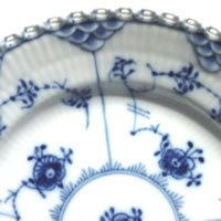 | 磁器とは1250〜1350℃の還元焼成(蒸し焼きの状態)の窯で焼かれたものをいいます。吸水性がなく堅く焼きしまっている、還元焼成のため、発色される色に限りがあり、濃い色があまりきれいに出ないという特徴があります。 これはデンマークの磁器メーカー・ロイヤルコペンハーゲン社のあまりにも有名なシリーズ「ブルーフルテッド」の「フルレース」の食器です。染付けとも呼ばれる手書きの下絵付けの施されたもので、素焼きの状態で絵付けをして、釉薬を施してから高温で焼成します。 |