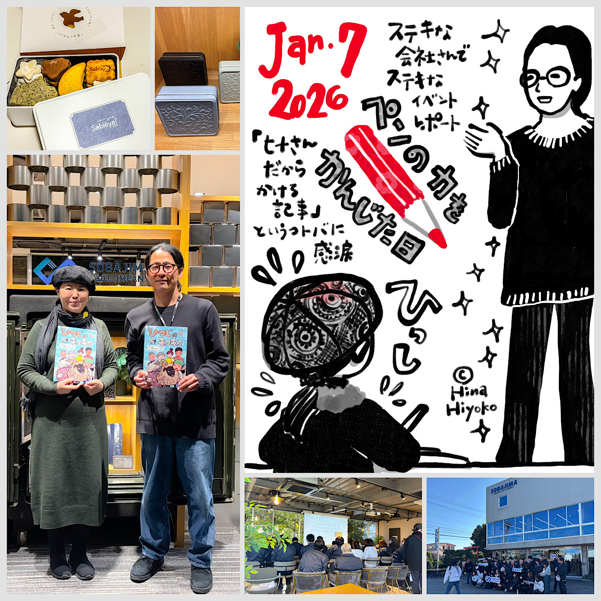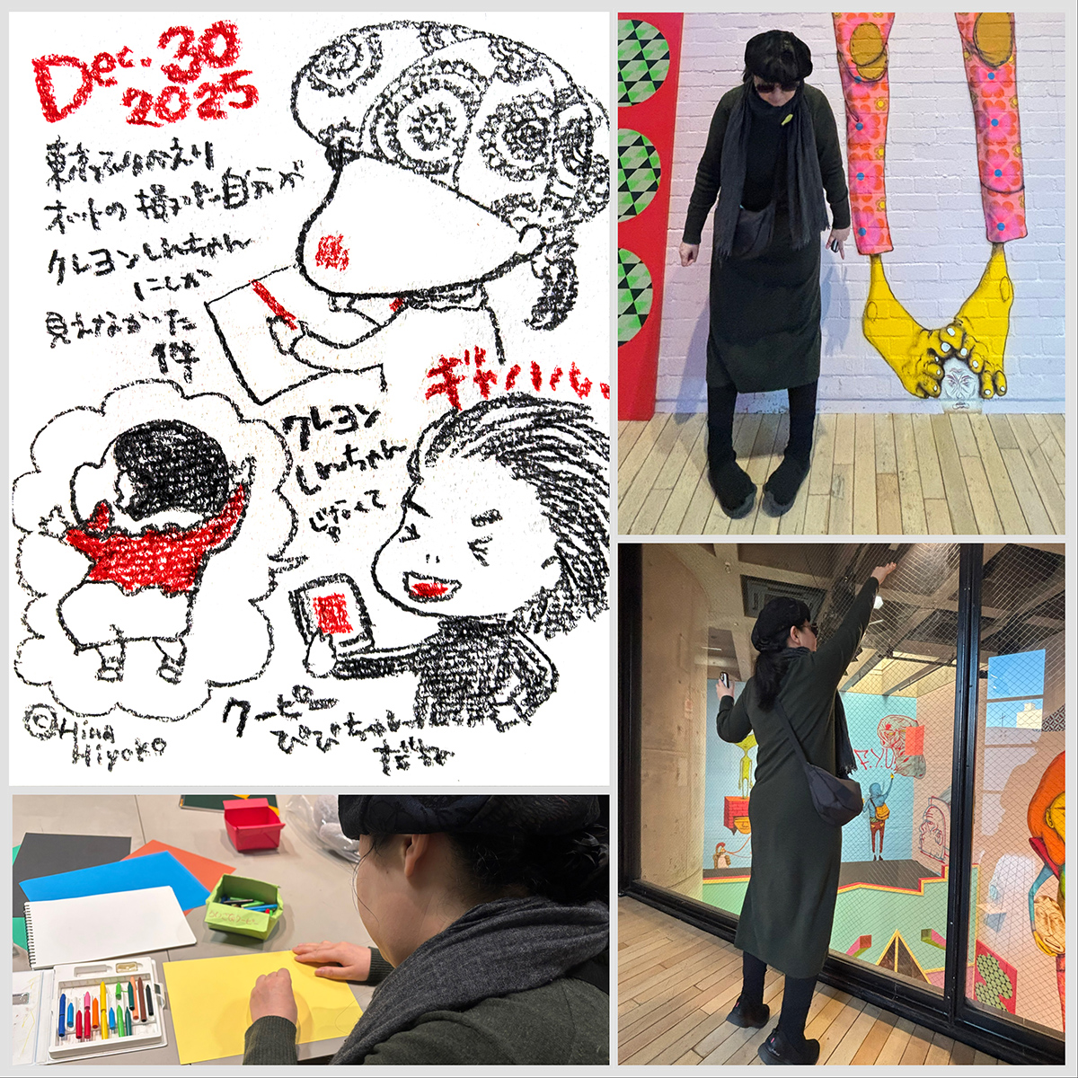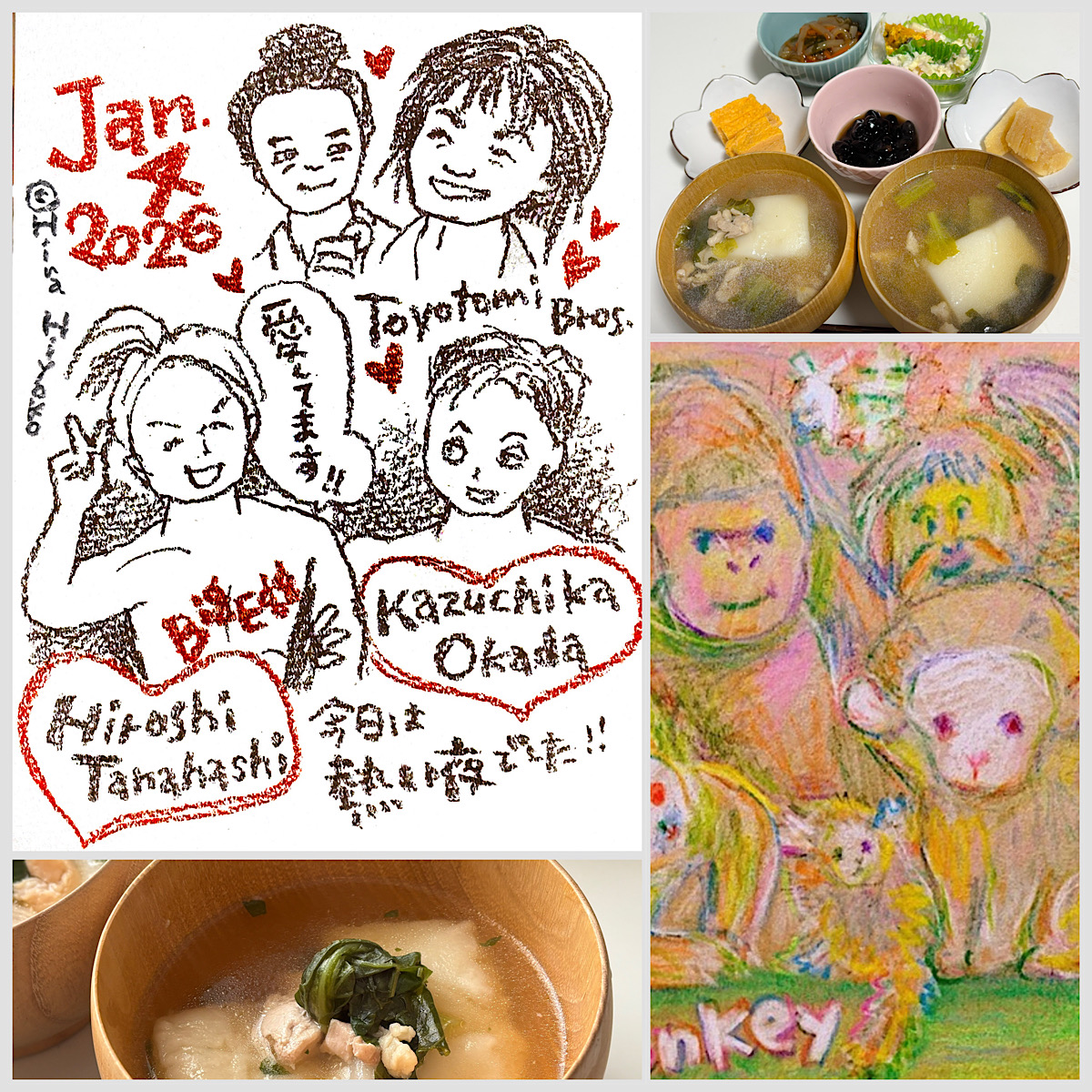 わたしが描いた絵は、左下の画像の上の方のスケッチブック、3匹のワンコを描いた絵。