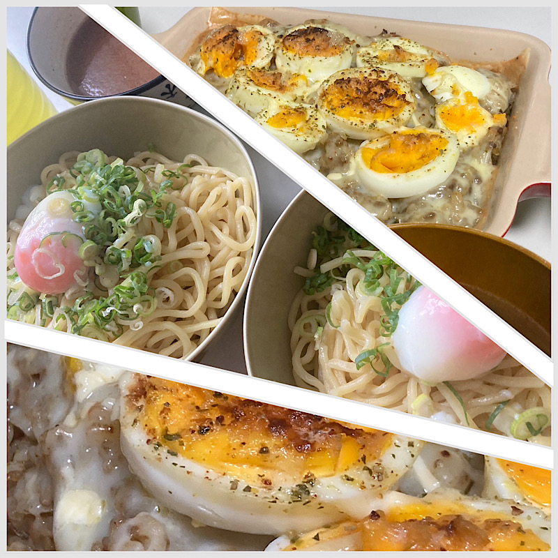 夜は昨日のドライカレーをグラタン皿に敷きチーズとゆで卵重ねてマヨ絞って焼くだけ。