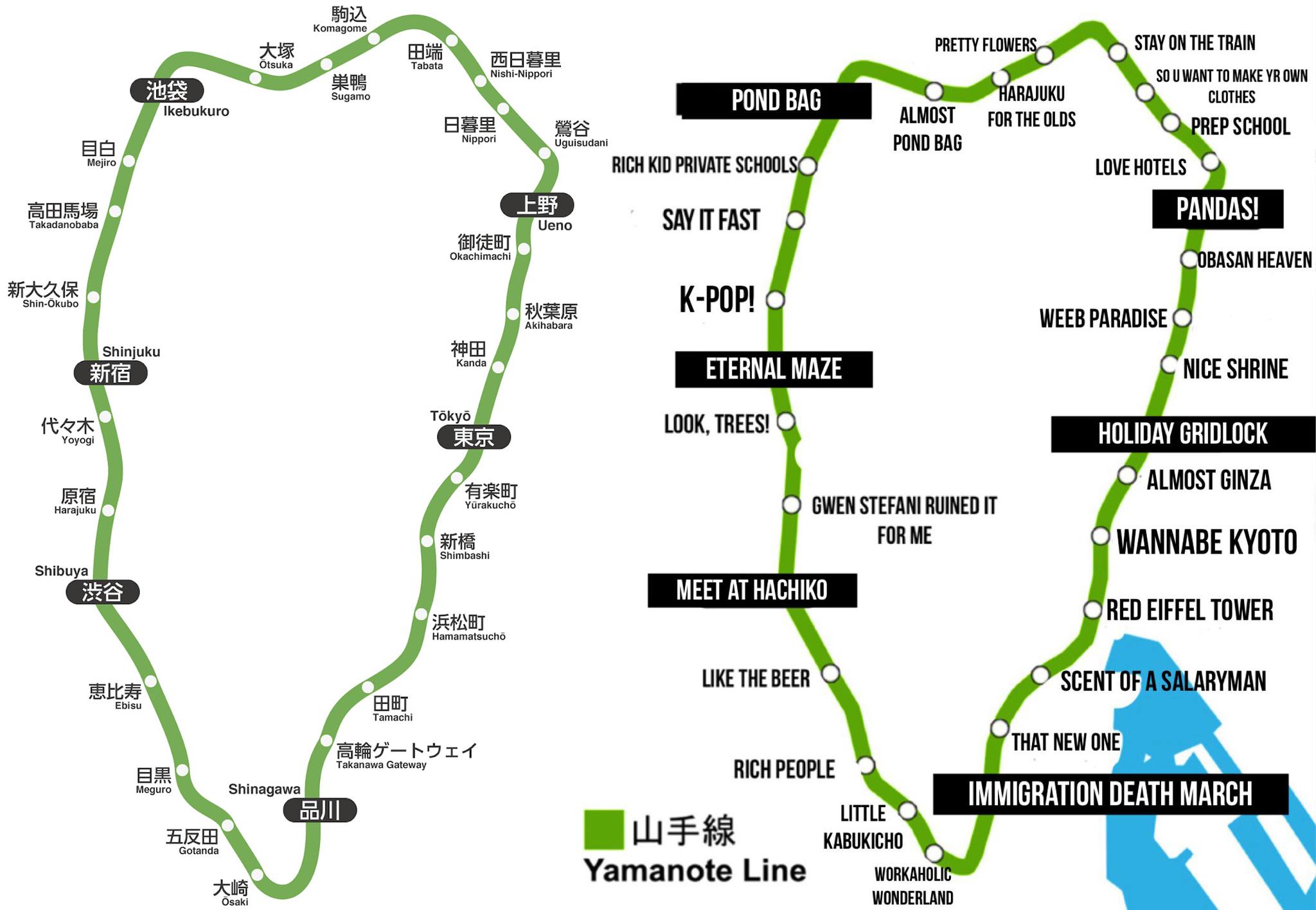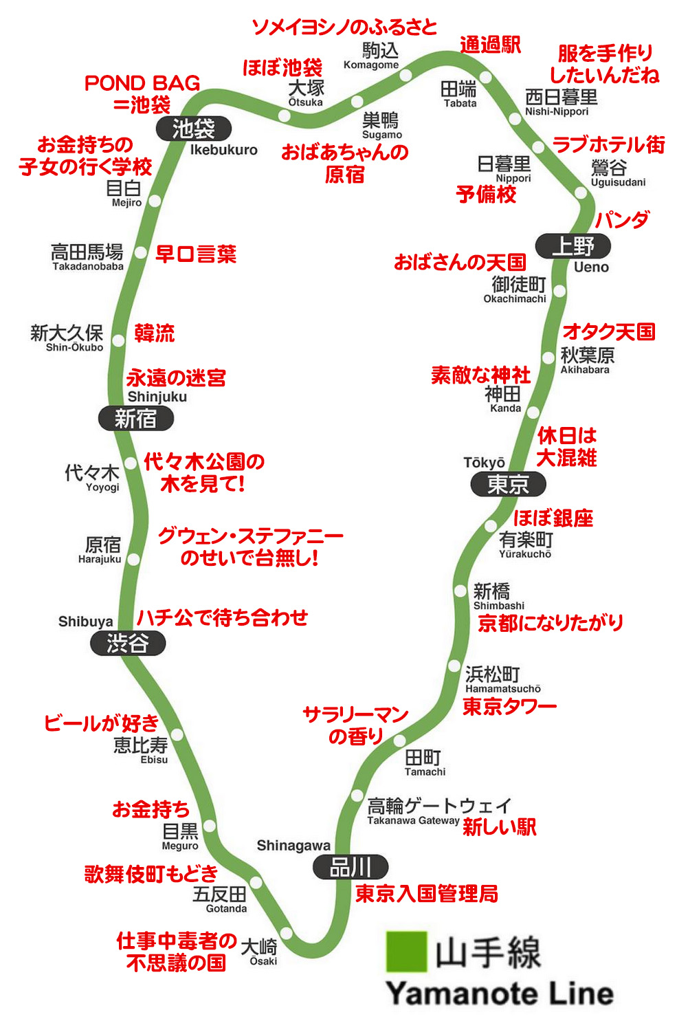 外国人の考える山手線駅の印象、だっけな?上野「パンダ!」とか渋谷「ハチ公で会う(待ち合わせ)」浜松町「東京タワー」とかはわかりやすい。巣鴨は「おばあちゃんの原宿」そのまんま。