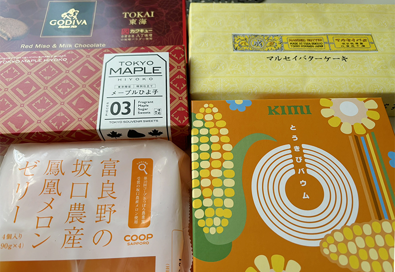 左上の味噌GODIVAはうちからのお土産として配ったもの。自分たちの分も買ったので、これから食べる(食べる前に配るという…)。メープルひよ子は東京限定、とうきびバウムは北海道限定。美しく暖色系。