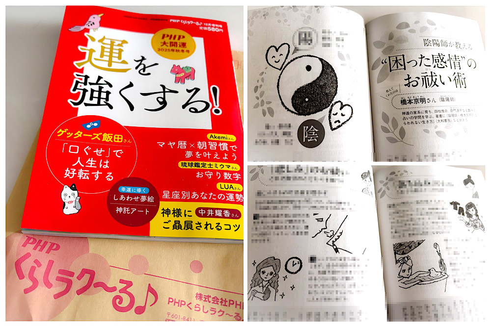 「PHPくらしラク〜る」12月号の特集「運を強くする!」の中の「困った感情のお祓い術」のイラストを担当。